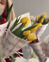 Букеты из 7 тюльпанов Россия в тематической упаковке: фоамиран + пленка с надписями "8 Марта".