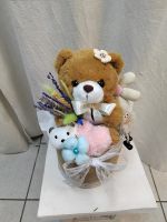 Состав: плюшевый мишка высота 18-20 см, меховой брелок - 2 шт. декоративная подвеска из ткани - 2 шт,