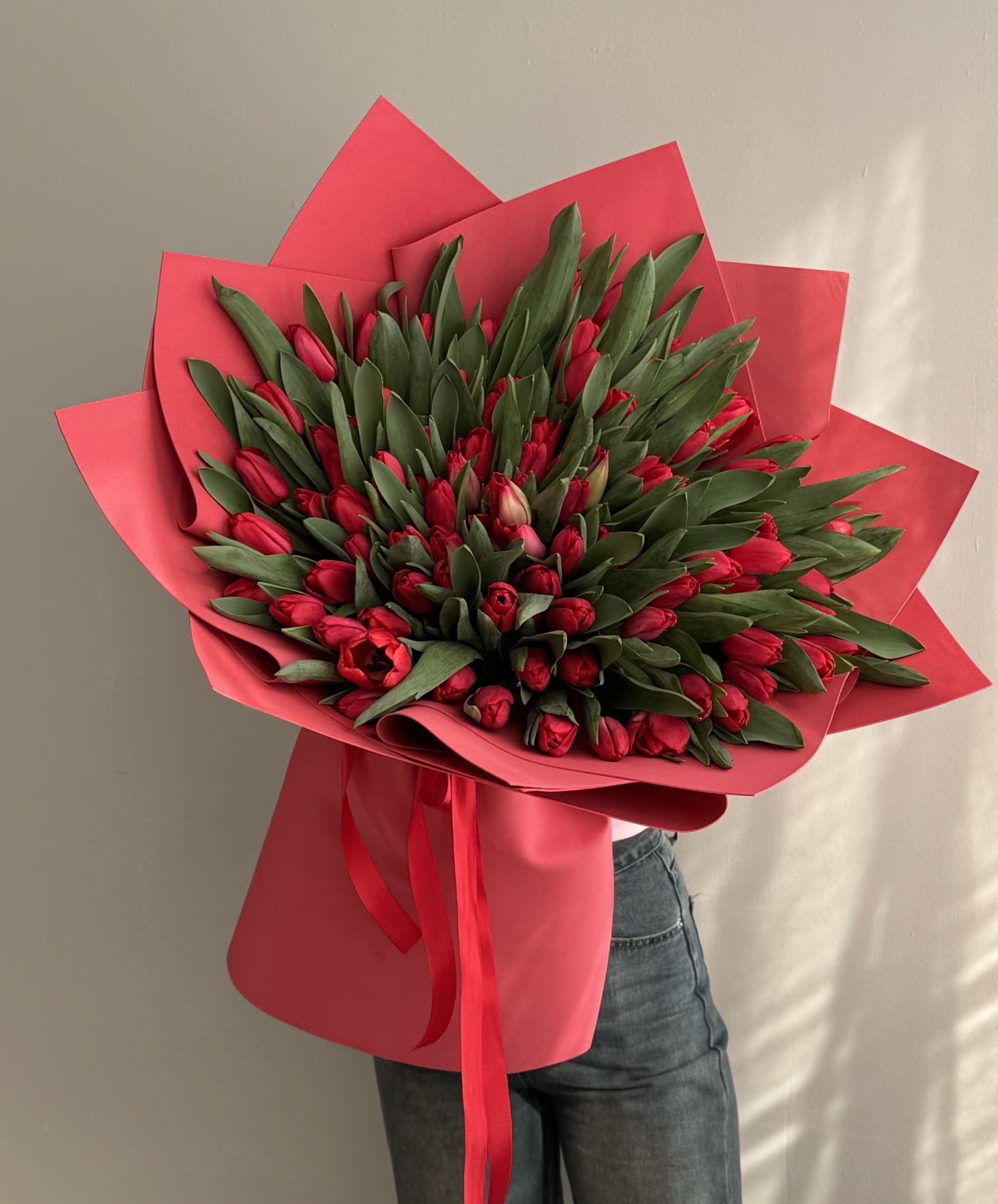 Роскошный объемный букет из 101 красного тюльпана, упакованный в современный фоамиран, символизирует сильную любовь и страсть. Фоамиран придает композиции нежность, воздушность и защиту, подчеркивая насыщенный цвет бутонов. Это идеальный подарок на 8 Марта или романтическую дату, создающий эффектное, богатое впечатление.