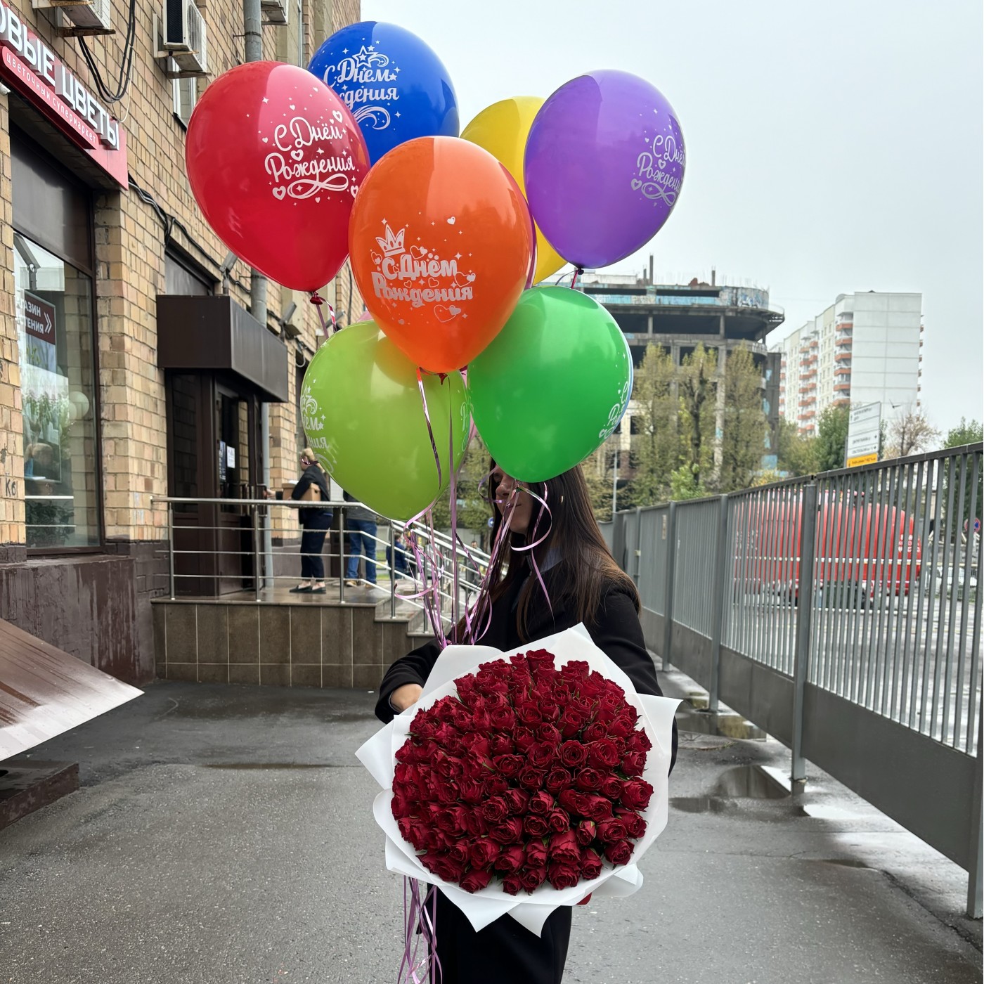 Состав: роза красная длины 40 см - 101 шт, упаковка, шар латекс на ленте -7 шт