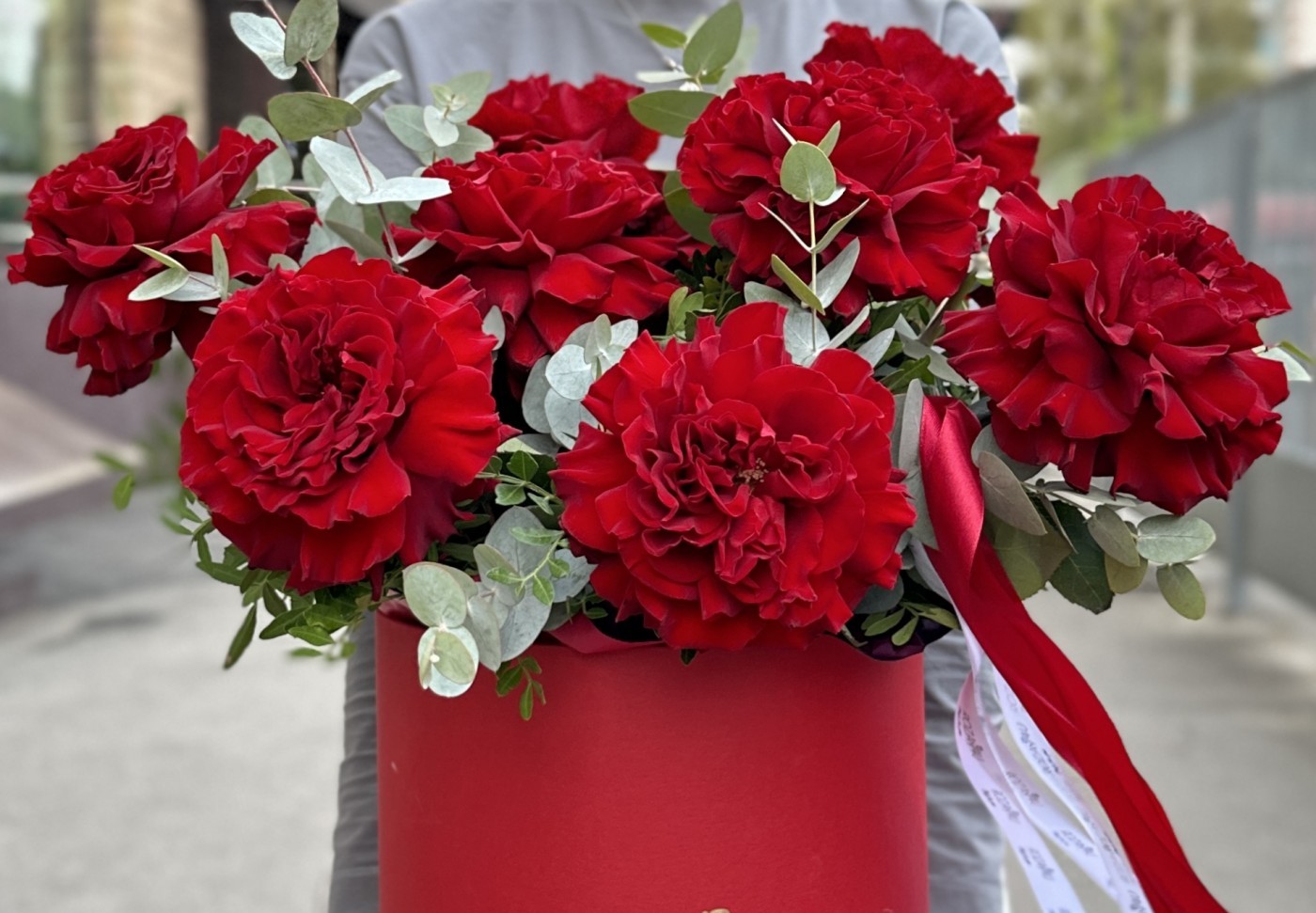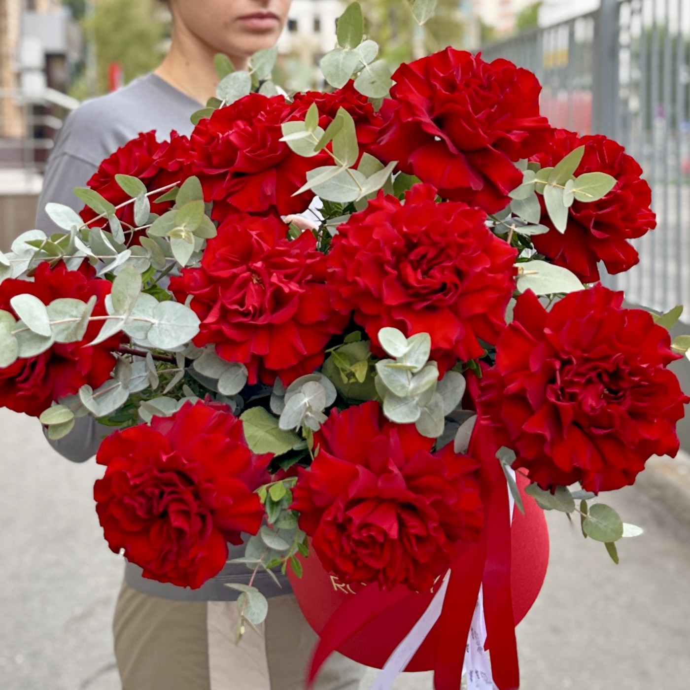 Состав: ажурная роза Хартс - 11 шт, эвкалипт - 10 шт, коробка, оазис - 1 шт