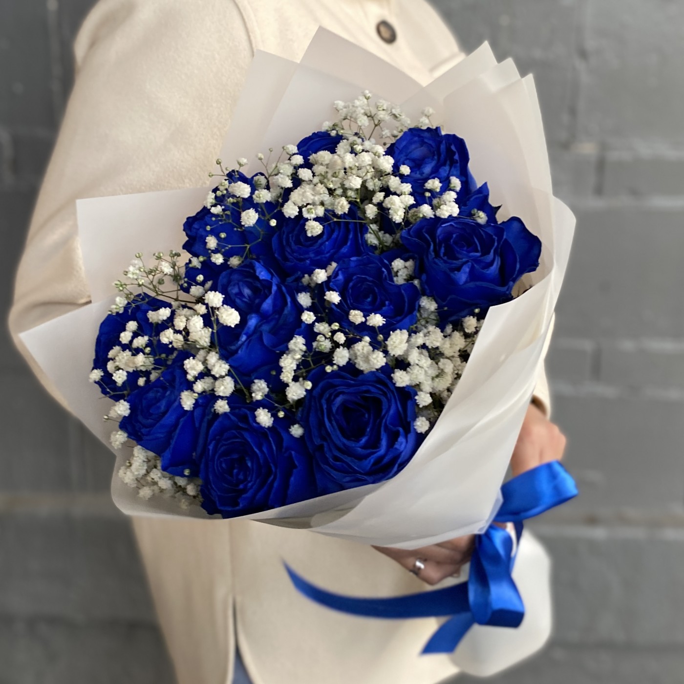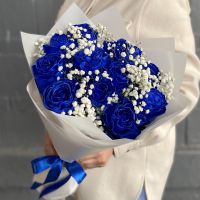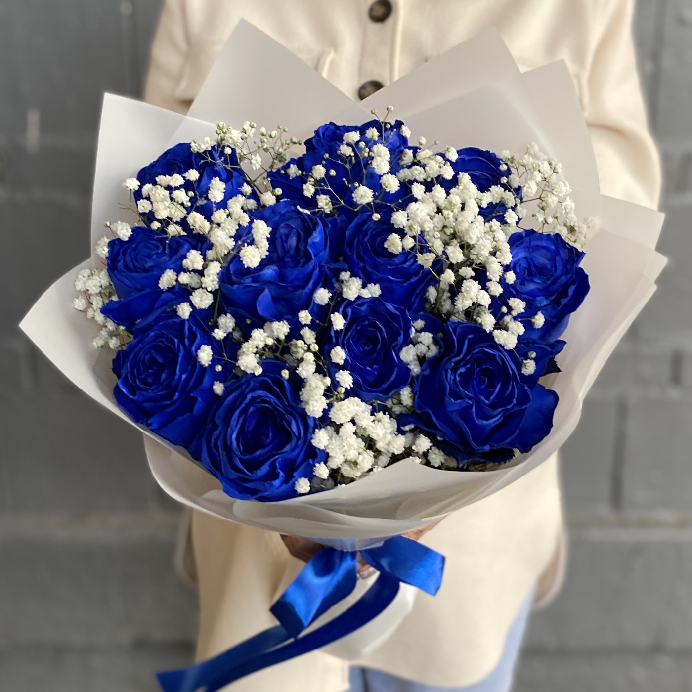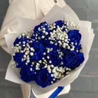 Состав: роза Эквадор синяя - 11 шт, гипсофила белая - 2 ветки. упаковка