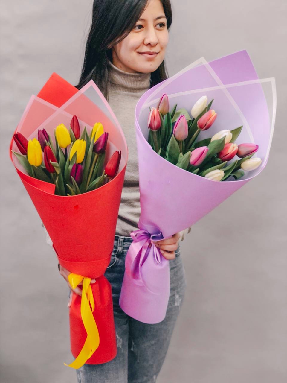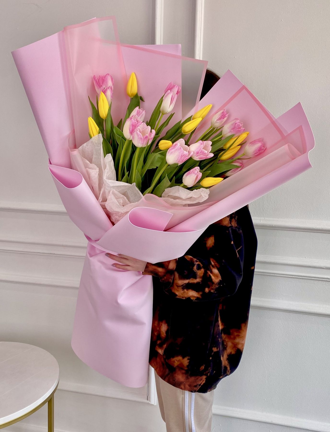 Цвет упаковки подбирается к цветовой гамме тюльпанов и может отличаться от представленной на фото.