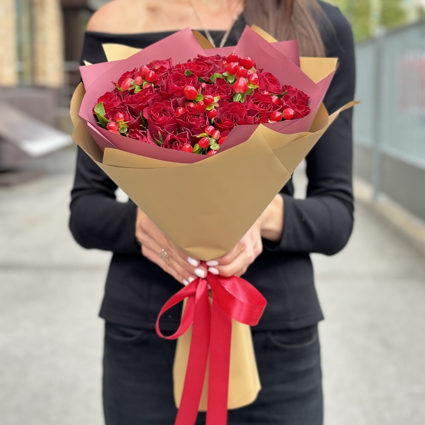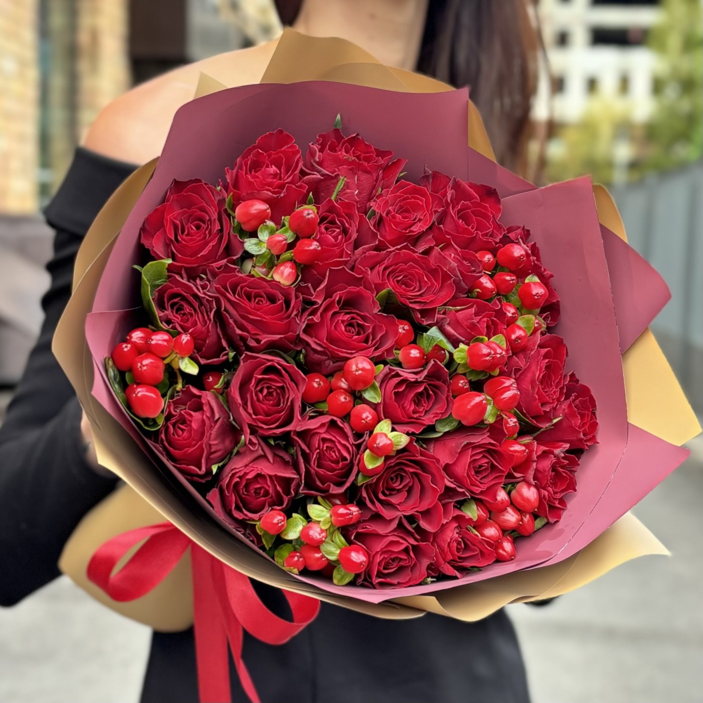 Состав: 25 красных роз Кения, гиперикум - 7 шт, упаковка