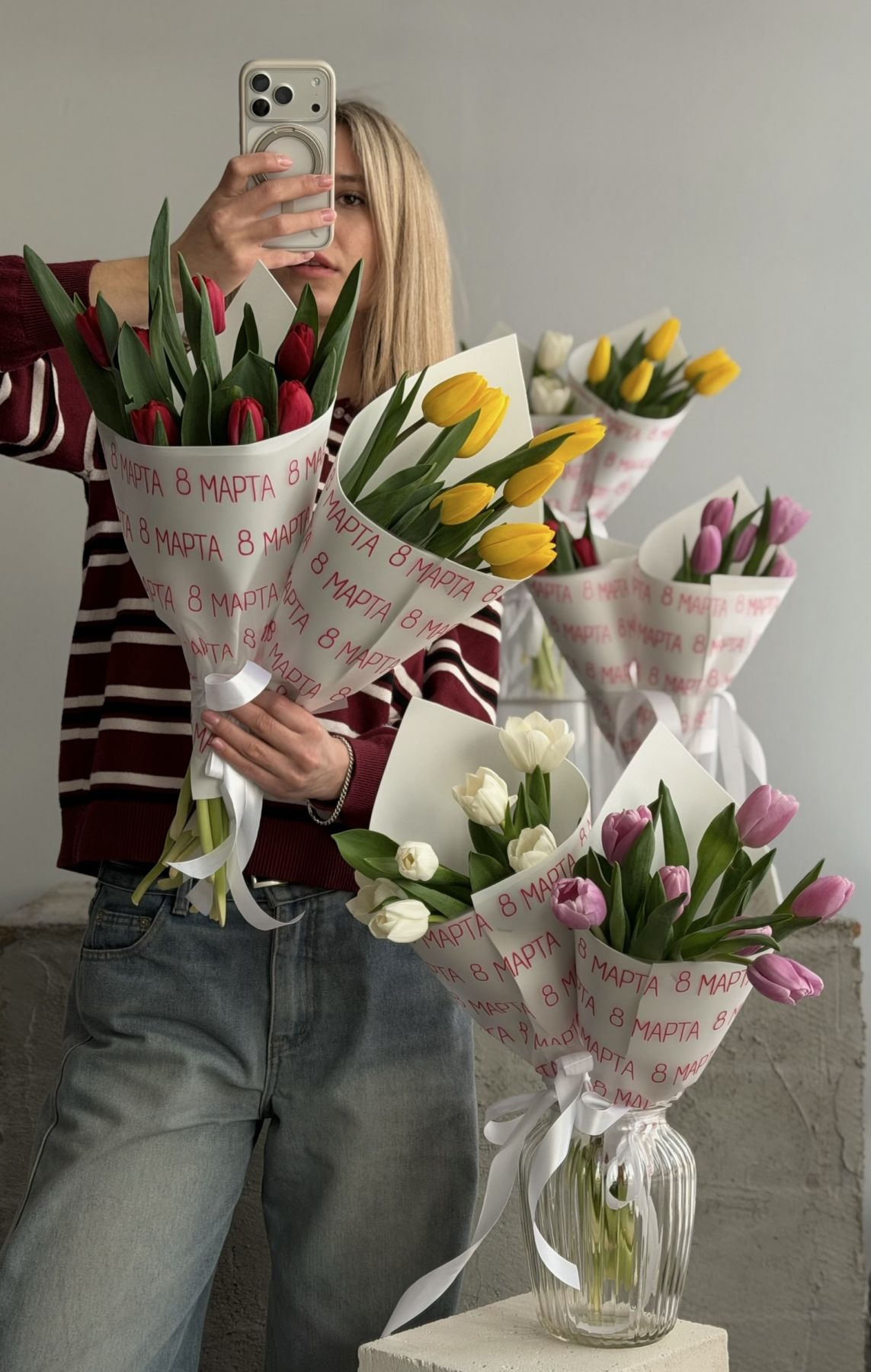 Букеты из 7 тюльпанов Россия в тематической упаковке: фоамиран + пленка с надписями "8 Марта".