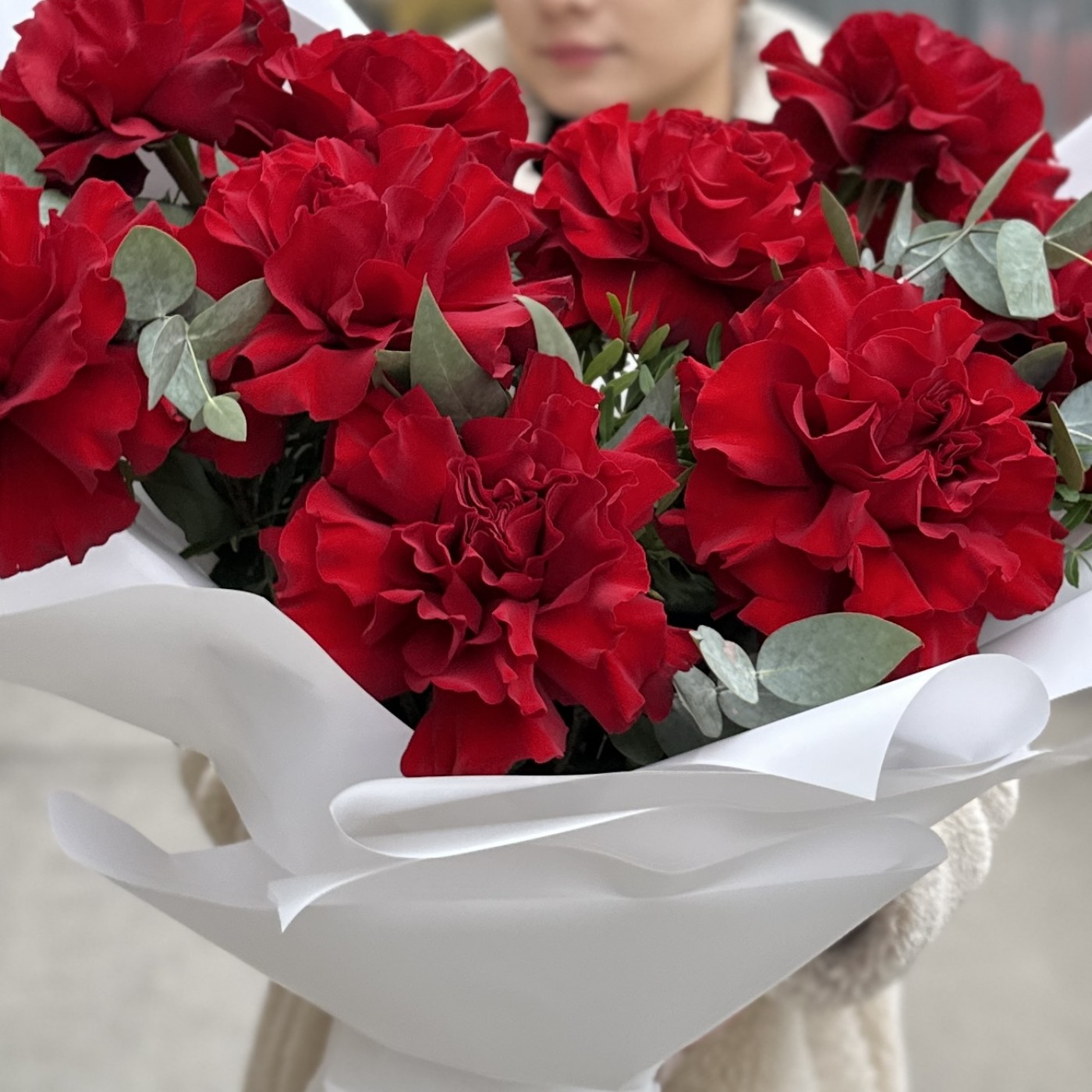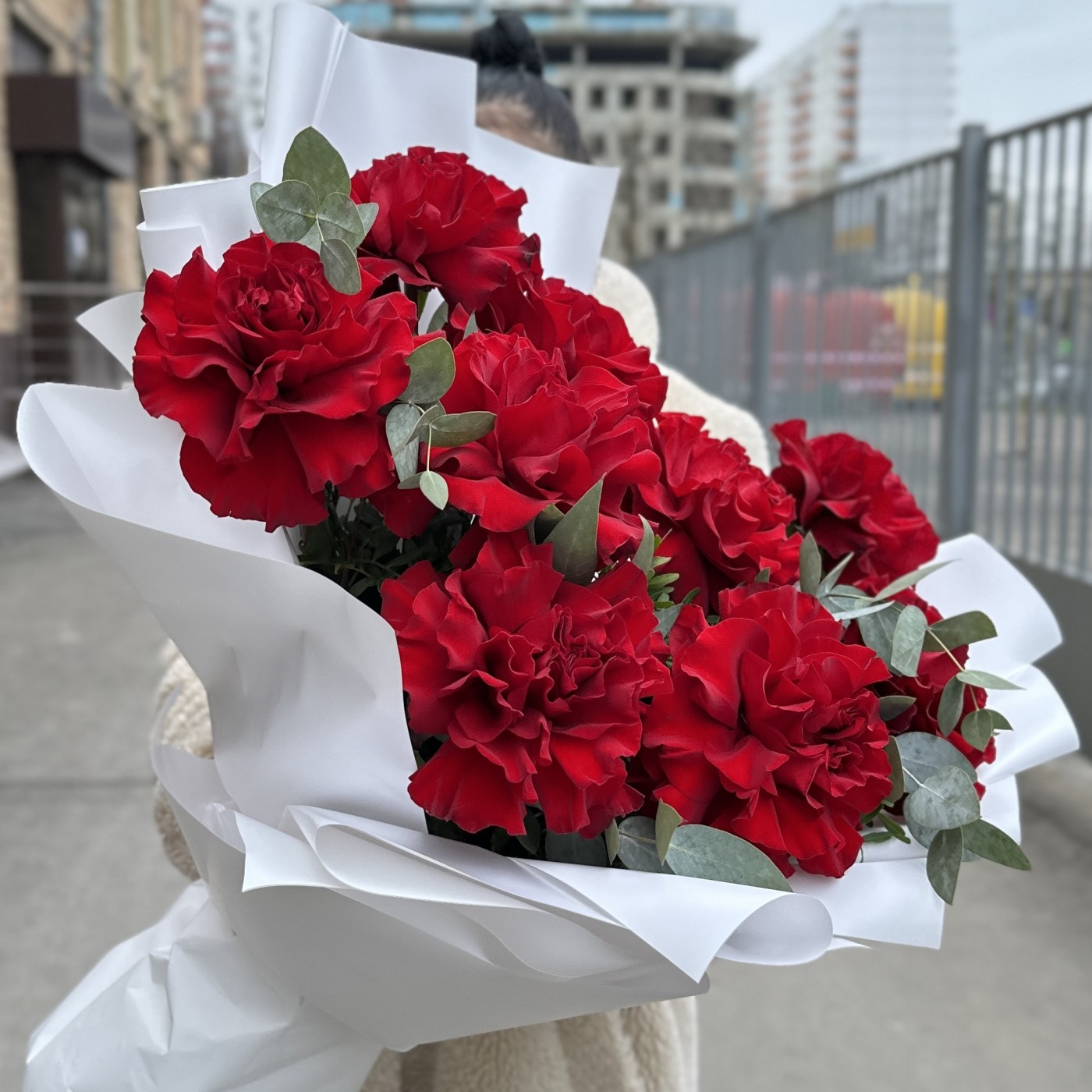 Состав: ажурная роза Хартс - 9 шт, эвкалипт - 6 шт, упаковка