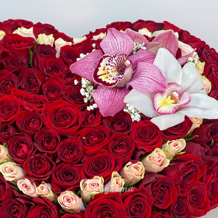 Состав: роза красная и розовая - 101 шт, бутон орхидеи цимбидиум - 3 шт. гипсофила - 1 ветка,