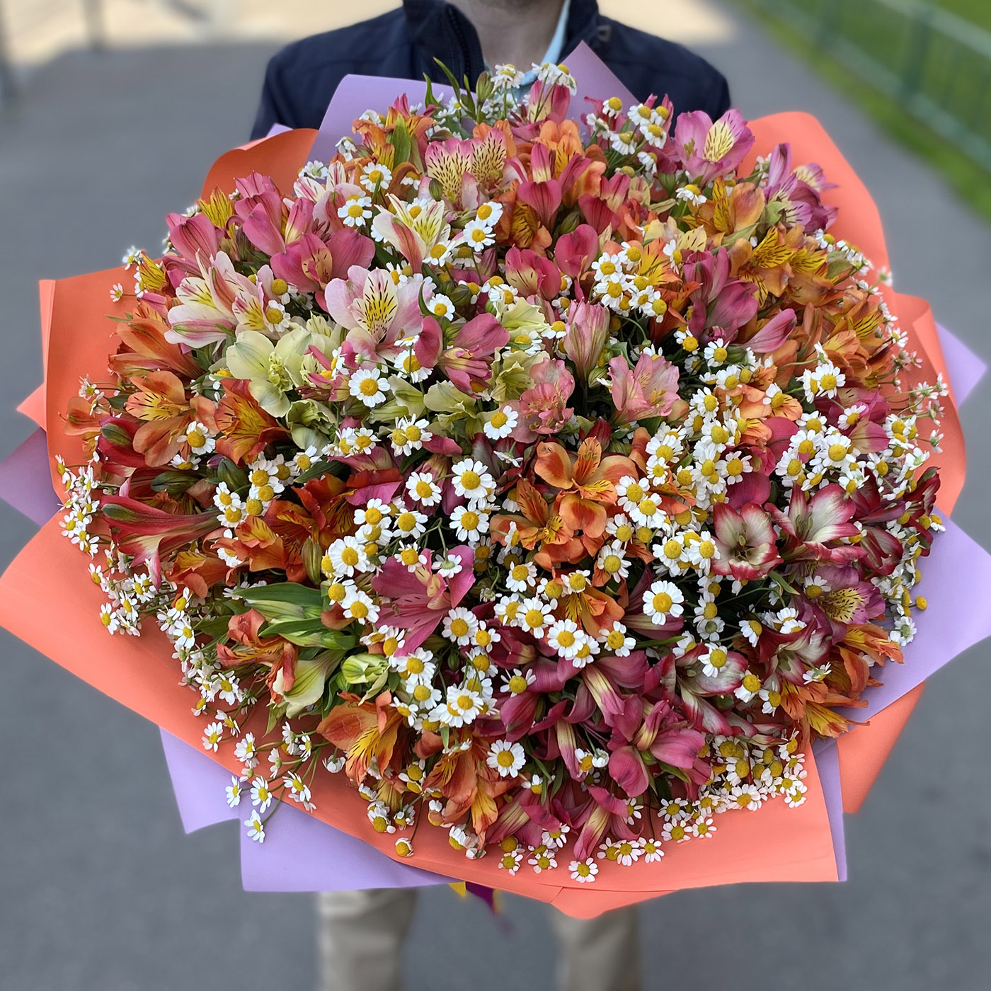 Состав: альстромерия - 37 шт, ромашка танацетум - 14 шт, упаковка