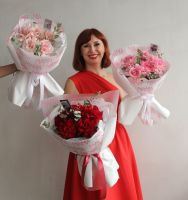 Состав: роза вывернутая - 5 шт, эвкалипт - 4 шт, фирменная упаковка с принтом "мама", открытка для мамы на металлическом держателе.