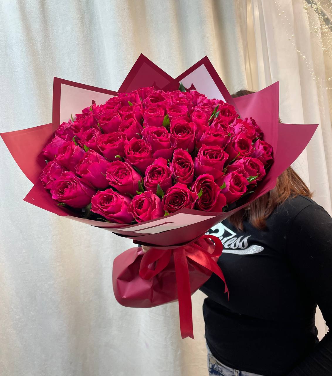 Состав: роза Кения длины 40 см насыщенного малинового цвета - 51 шт., стильная упаковка