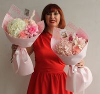 Состав: гортензия - 1 шт, французская роза - 1 шт, кустовая пионовидная роза - 1 шт, диантус - 1 шт, лагурус - 3 шт, фисташка - 1 шт, упаковка, открытка