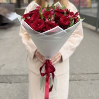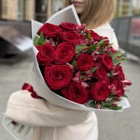 Состав: красная роза - 15 шт, малиновая альстромерия - 10 шт, упаковка