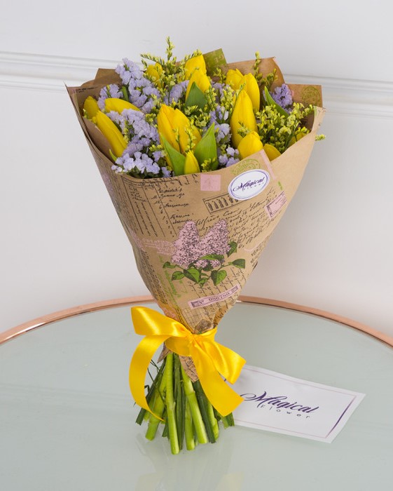 Состав: тюльпаны - 15 шт., статица - 5 шт., солидаго - 3 шт., упаковка крафт