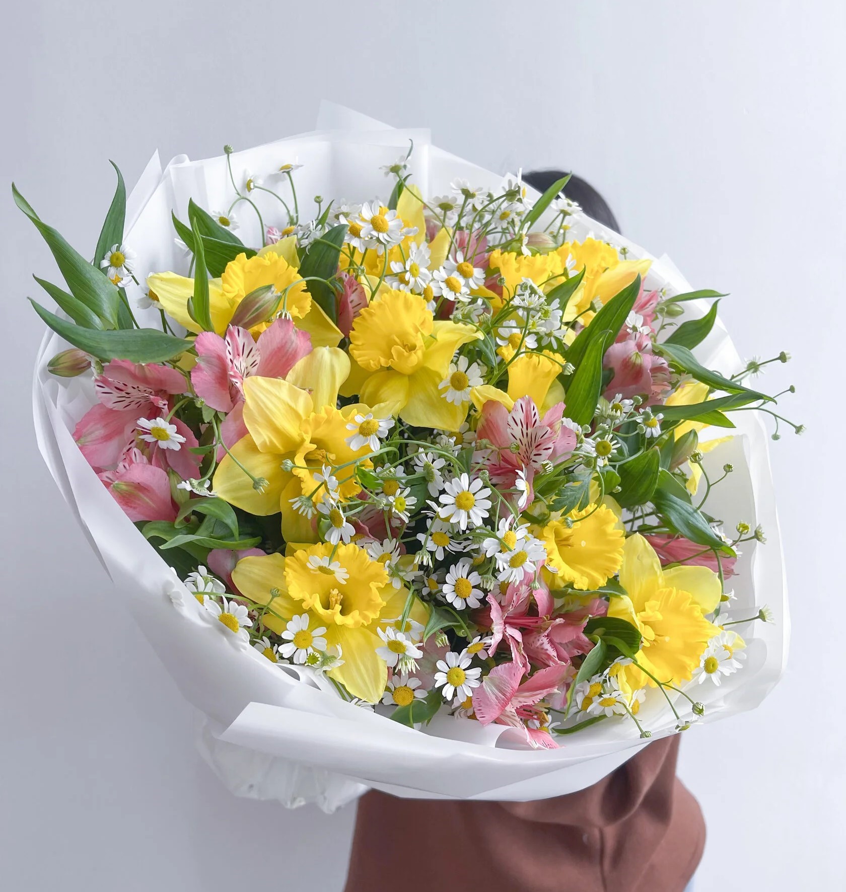 Состав: нарцисс - 10 шт, альстромерия - 7 шт, танацетум - 8 шт, фисташка - 2 шт. упаковка