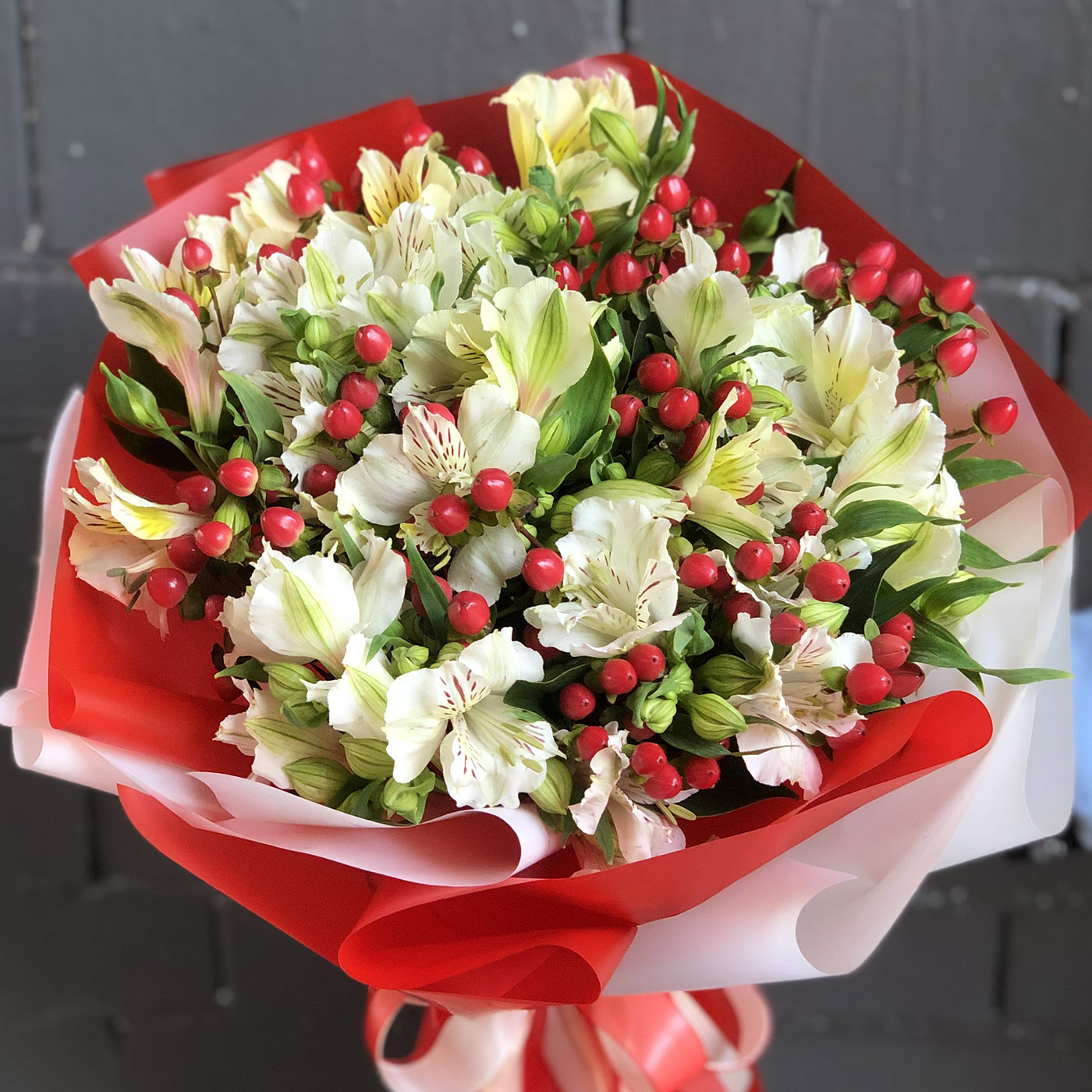 Состав: альстромерия белая - 20 шт, гиперикум - 11 шт. упаковка