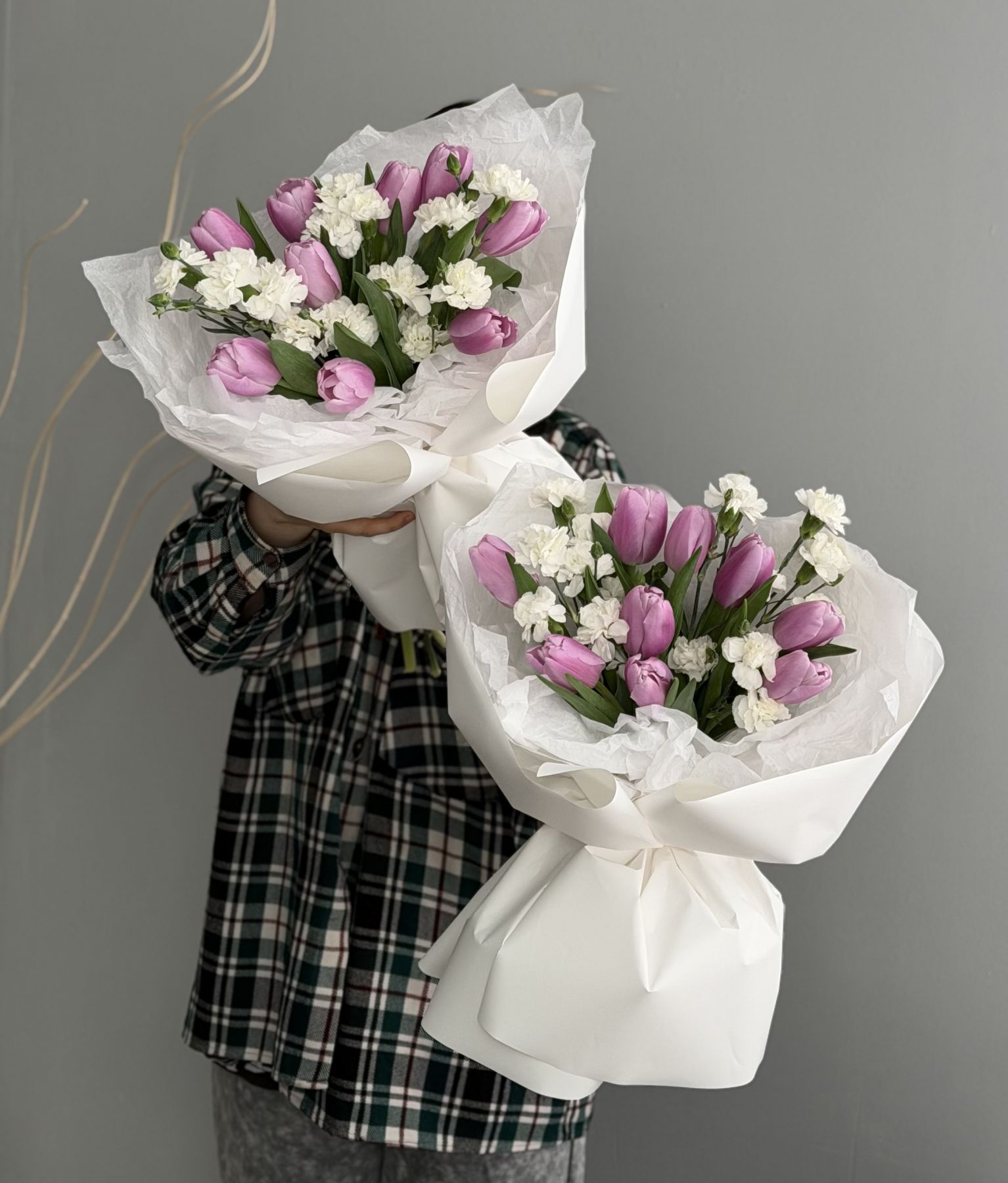 Состав: тюльпаны - 9 шт, кустовые диантусы - 4 шт, упаковка