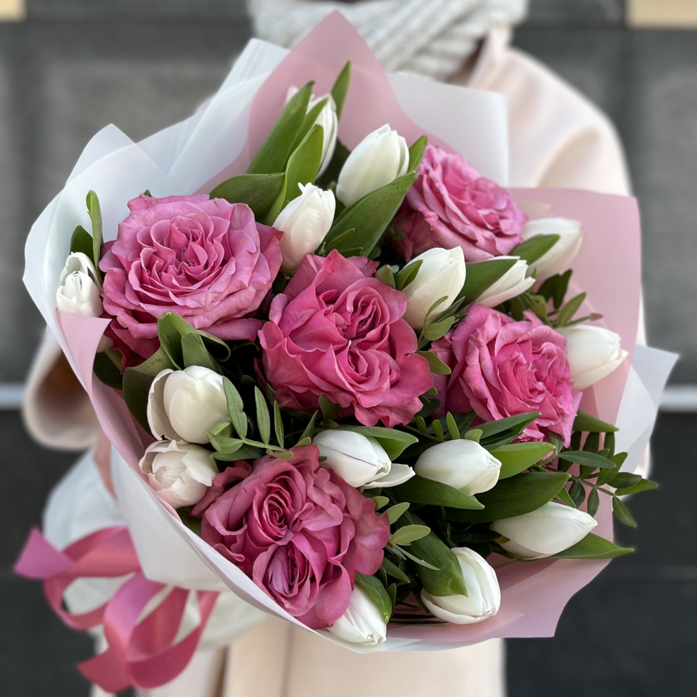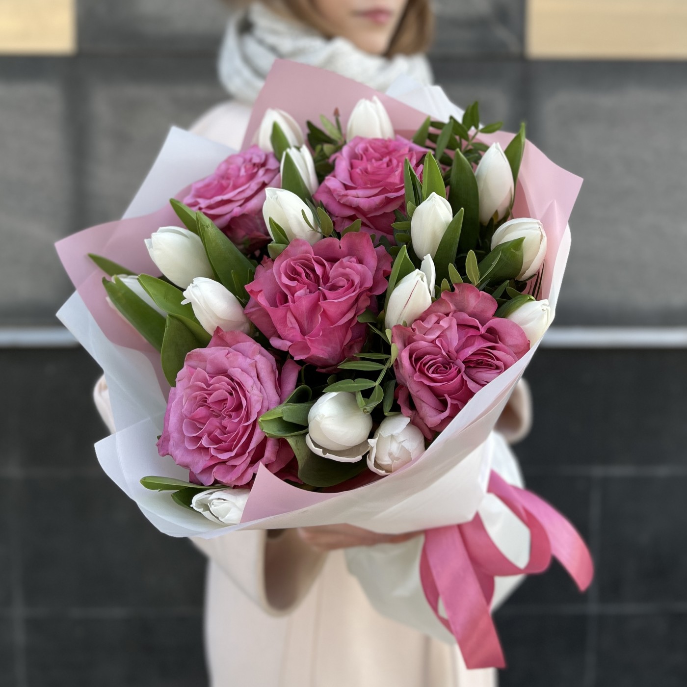 Состав: тюльпаны - 14 шт, роза Кантри блюз - 5 шт. фисташка - 2 ветки, упаковка