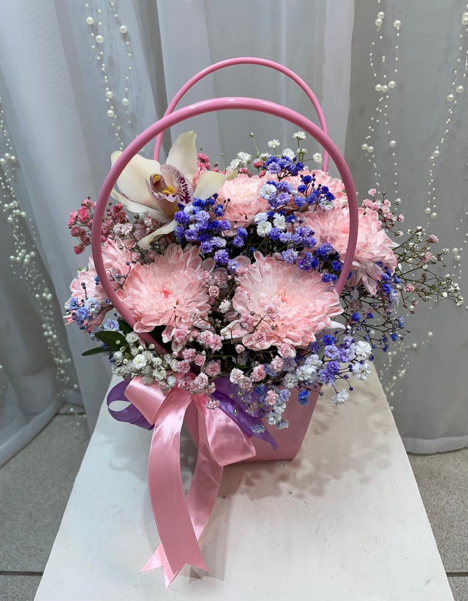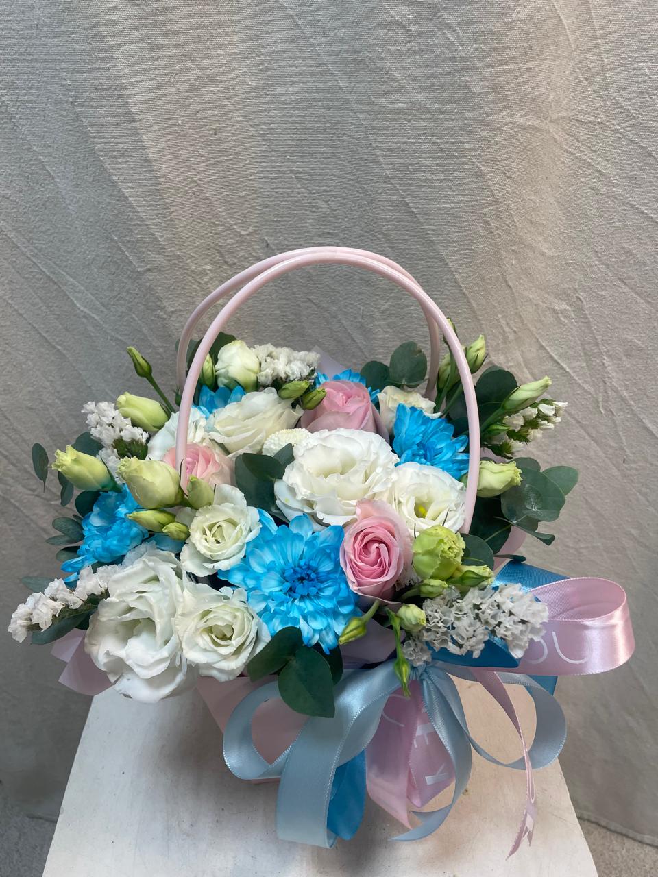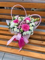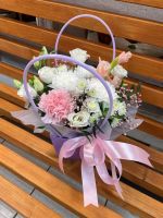 кустовая хризантема, одноголовые или кустовые розы, лизиантус, диантусы, зелень.