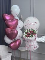Состав: тюльпаны 25 шт, упаковка тишью, матовая пленка с бантиками, шар баблс с индивидуальной надписью и бантиками на грузике, сердце фольга 18" - 4 шт, шар латекс пастель 12" с бантиками - 6 шт на грузике.