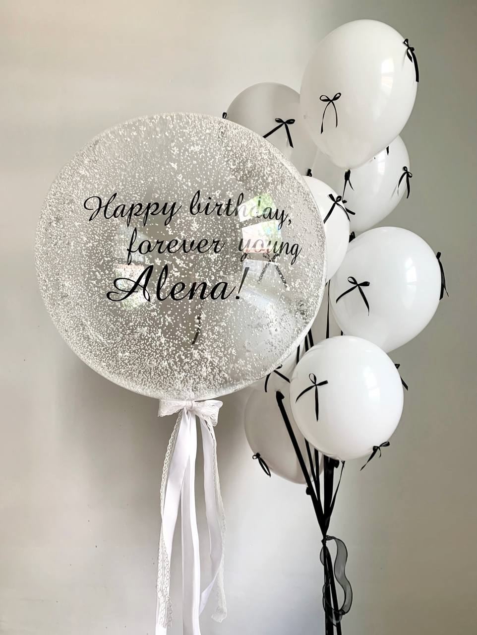 Цвет шаров, наполнение в шар, цвет ленты, надпись на шаре - согласовываются при заказе.