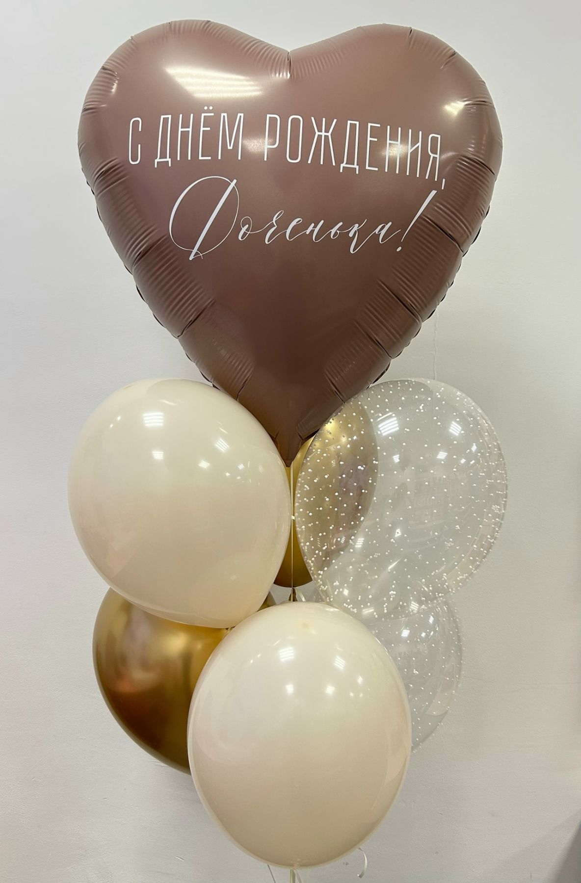 - 1 фольгированное сердце 75 см с вашей индивидуальной надписью, 2 однотонных латексных шара, 2 шара с наполнением, 2 хромированных шара;