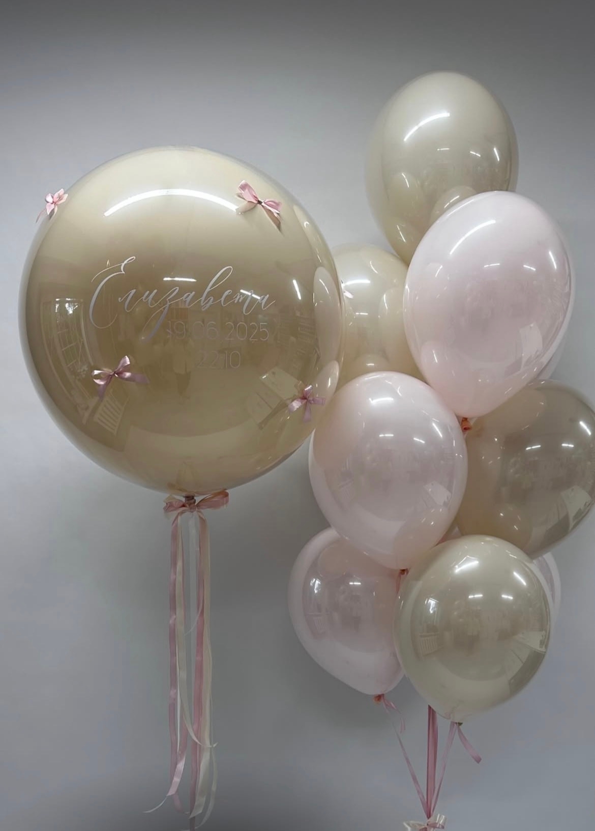 - 1 «стеклянный» шар Баблс 65 см с вашей индивидуальной надписью, с бантиками;