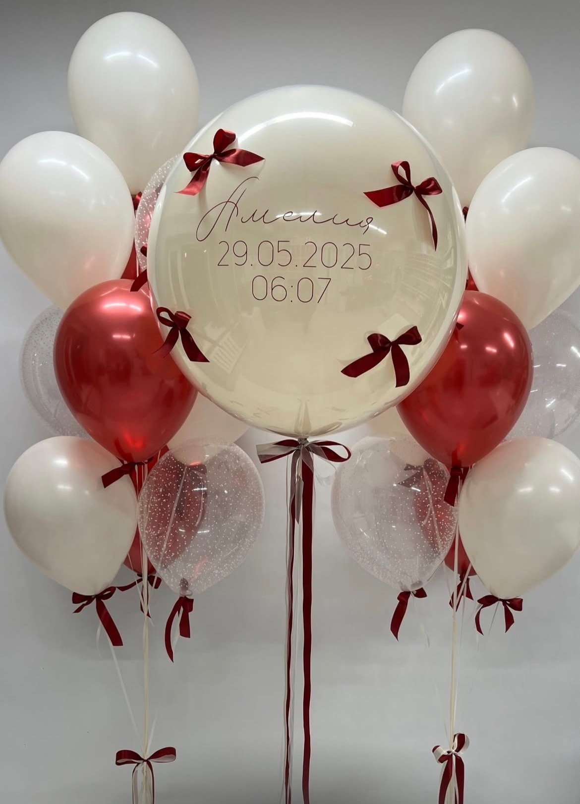 - 1 «стеклянный» шар Баблс 65 см с вашей индивидуальной надписью, с бантиками;