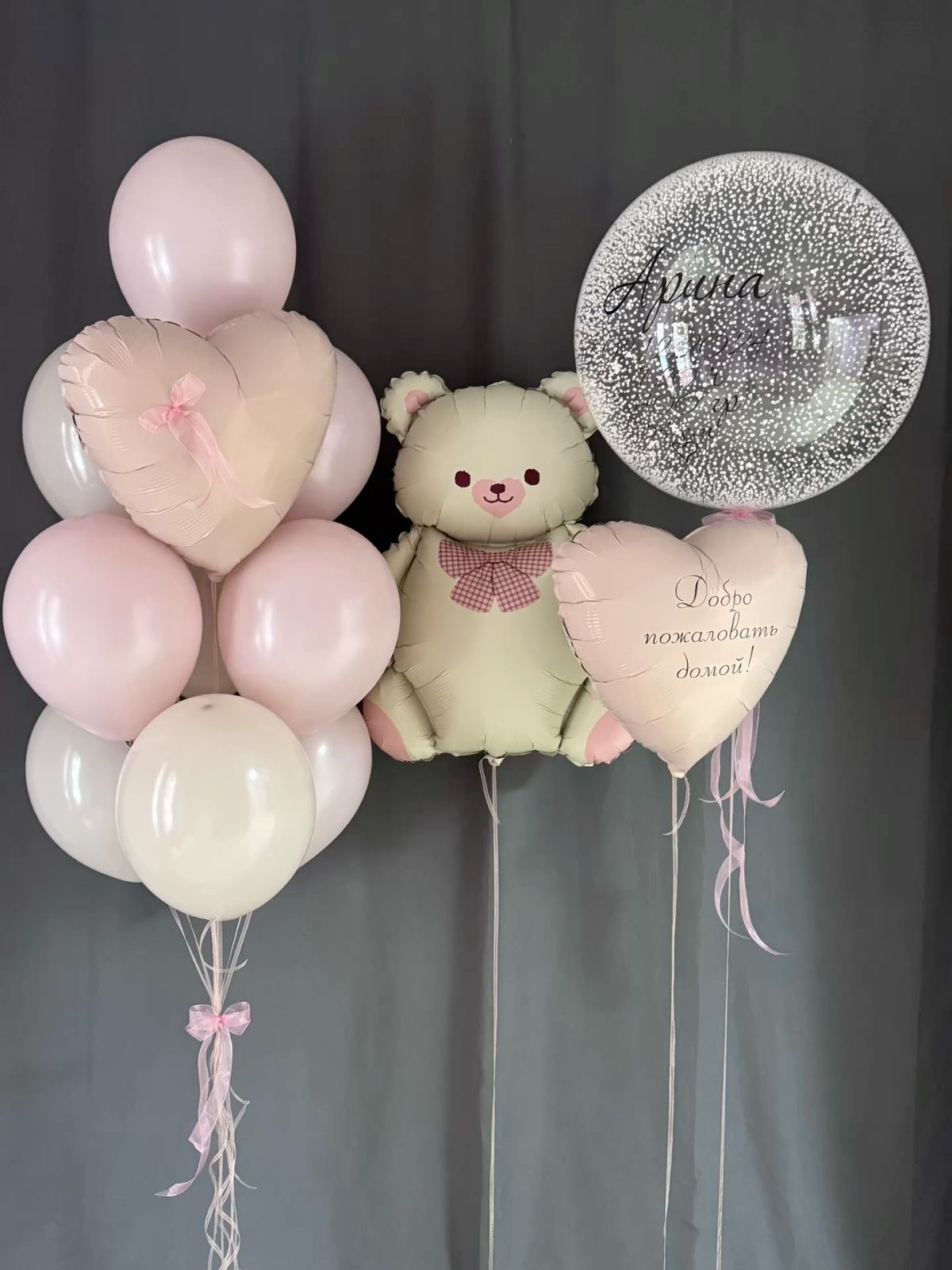Цвет шаров, цвет ленты, фигура, надпись на шар, количество - заменяемы, согласовываются при заказе.