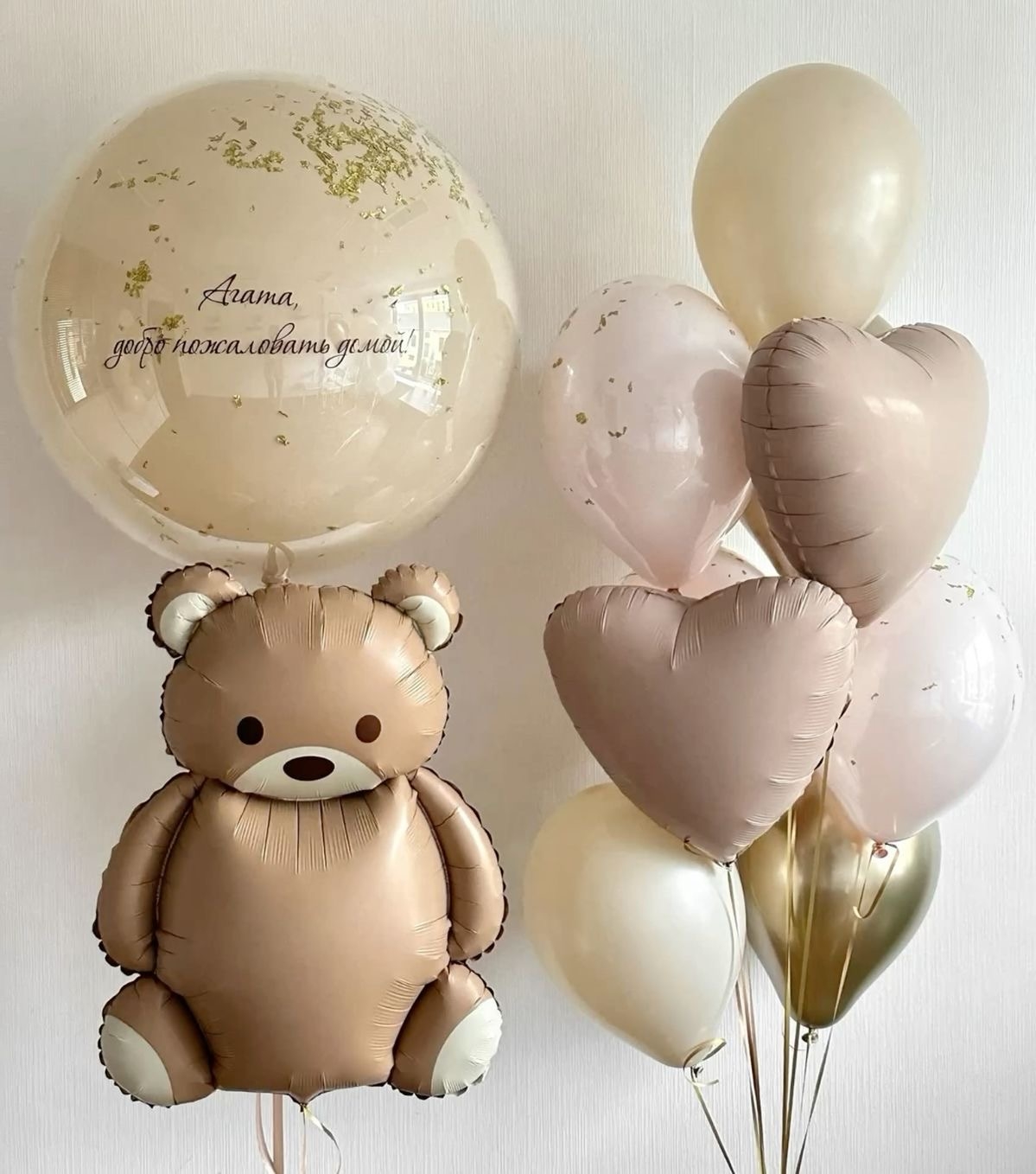Цвет шаров, цвет ленты, надпись на шар, фигура, количество - заменяемы, согласовываются при заказе.