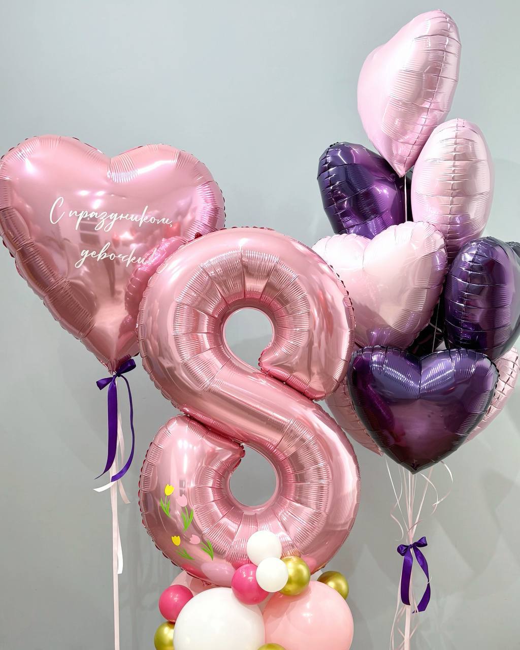 - 1 фонтан из 7 однотонных шаров сердце фольга 45 см;