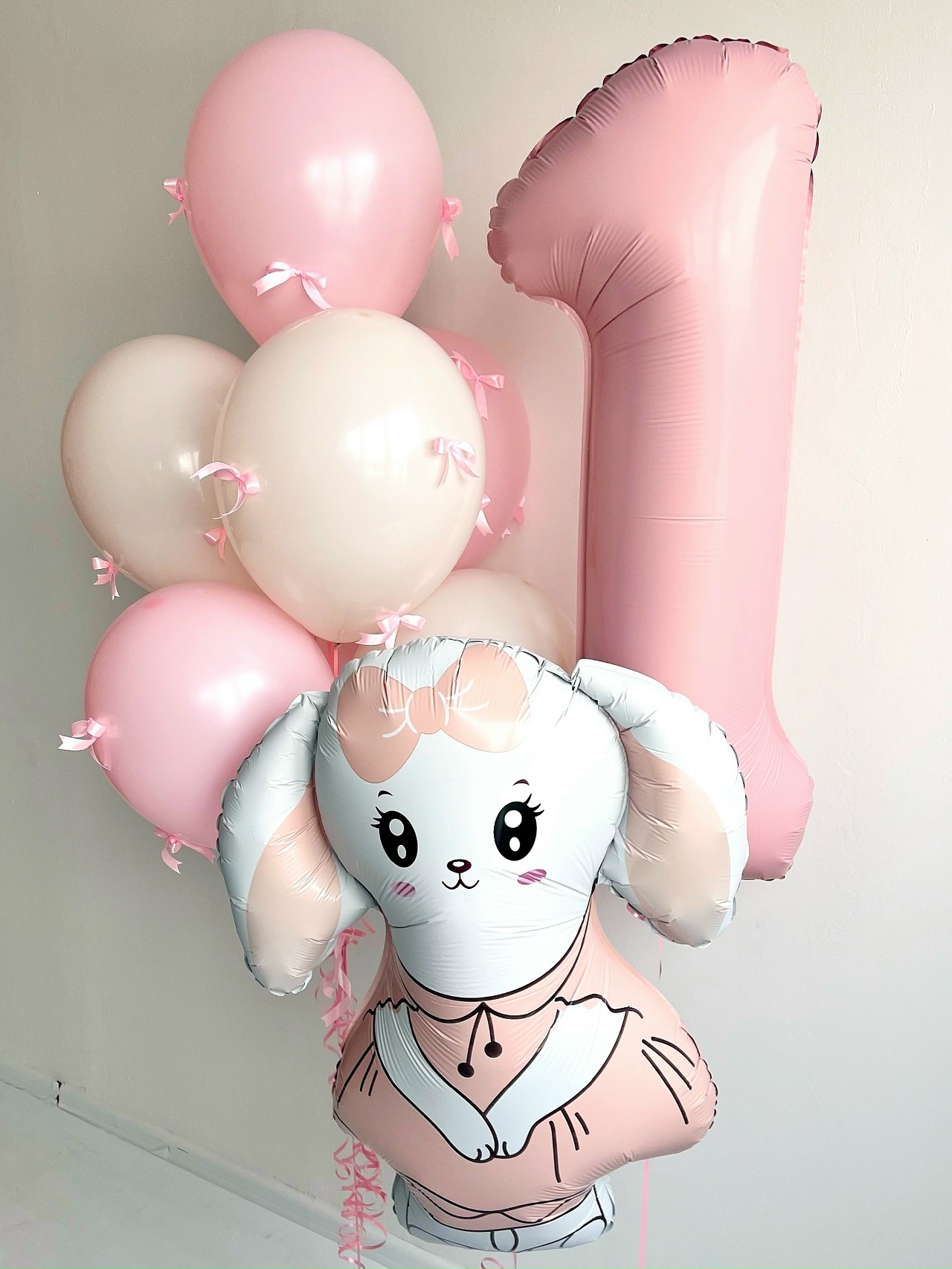 - фонтан из 7 однотонных латексных шаров пастель с бантиками из атласной ленты;
