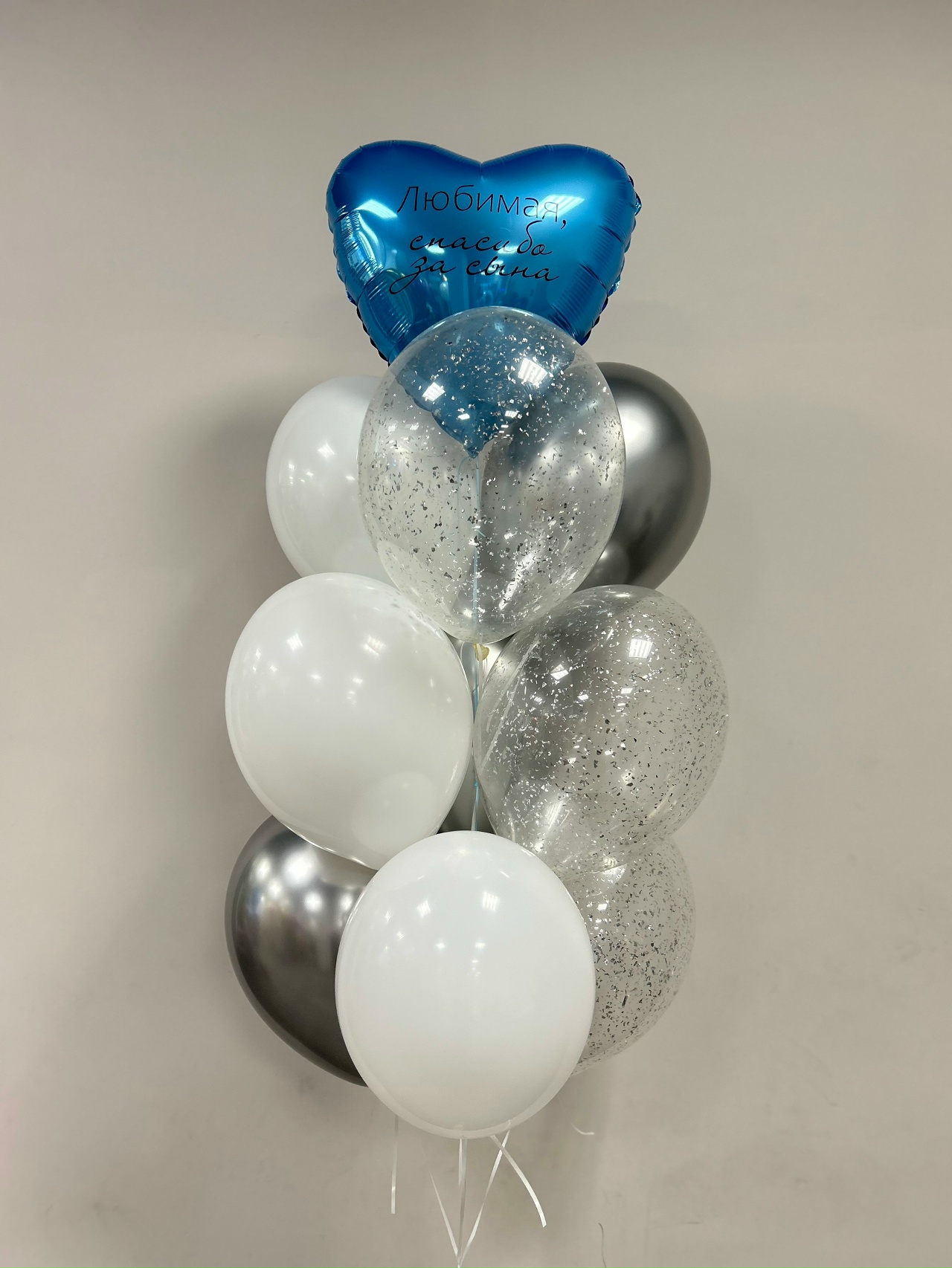 - фонтан из 10 шаров: 1 фольгированное сердце 45 см - с индивидуальной надписью, 3 однотонных латексных шара, 3 хромированных шара, 3 шара с наполнением;