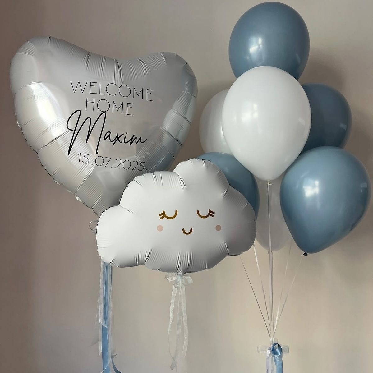 Цвет шаров, цвет ленты, надпись на шар, фигура - заменяемы, согласовываются при заказе.
