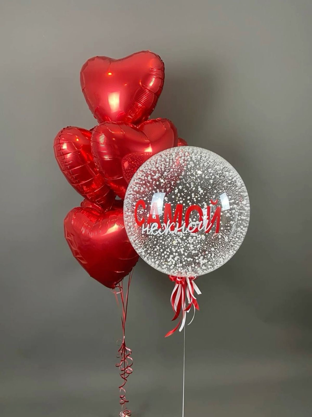 Цвет шаров, цвет ленты, надпись на шар, наполнение в шар (конфетти, пенопластовые шарики, перья) - заменяемы, согласовываются при заказе.