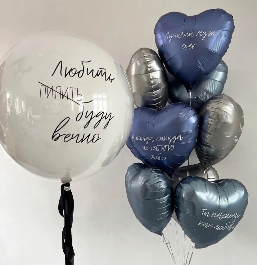 - фонтан из 8 фольгированных сердец 45 см, на 3 шарах ваша индивидуальная надпись;