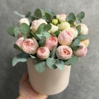 Состав: роза кустовая пионовидная менсфилд парк - 5 веток, эвкалипт, коробка, оазис