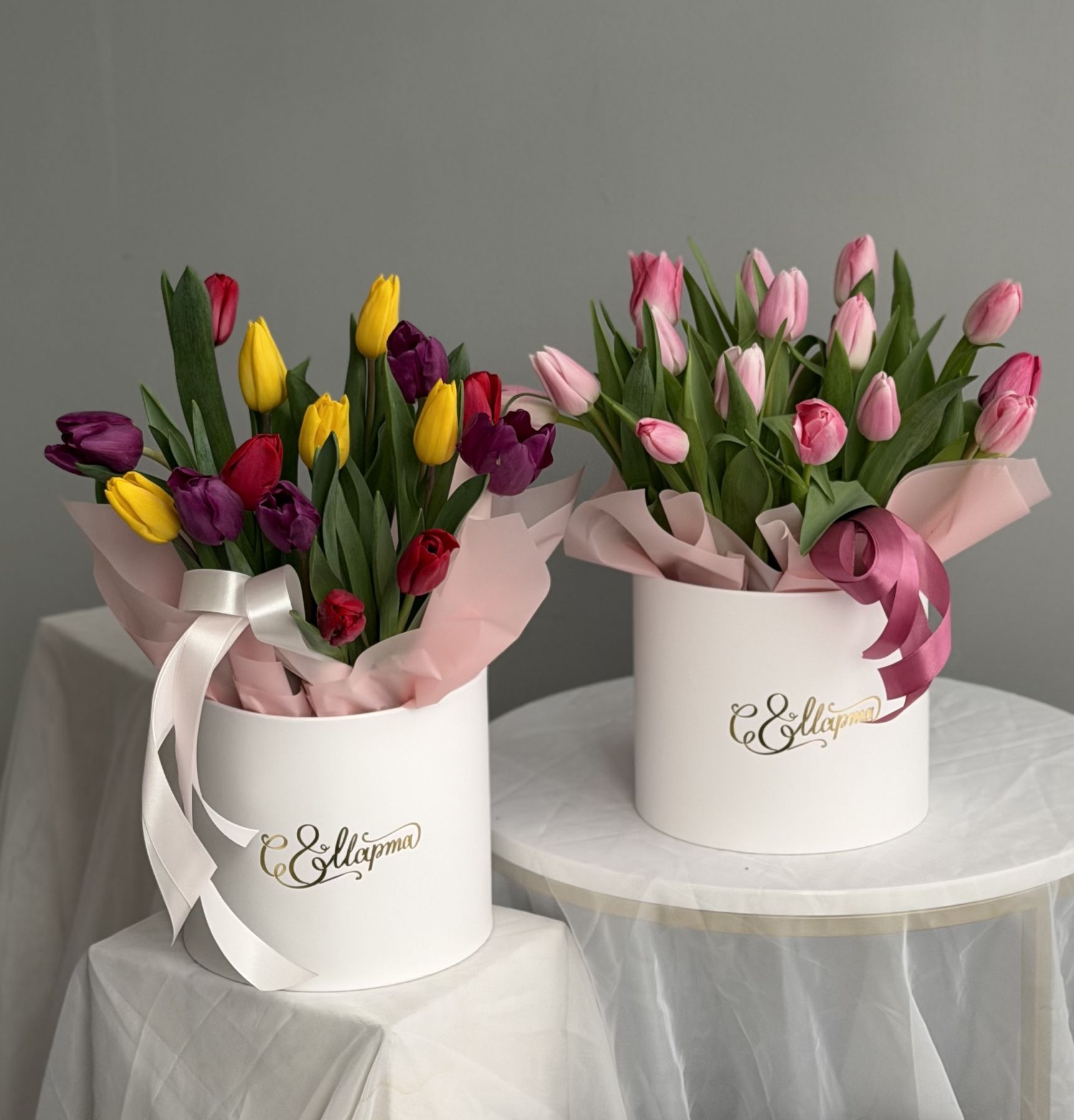 2. Тюльпаны нежный микс 15 шт, коробка, оазис, тишью, лента