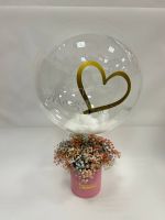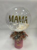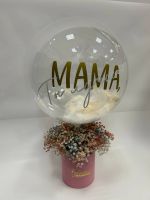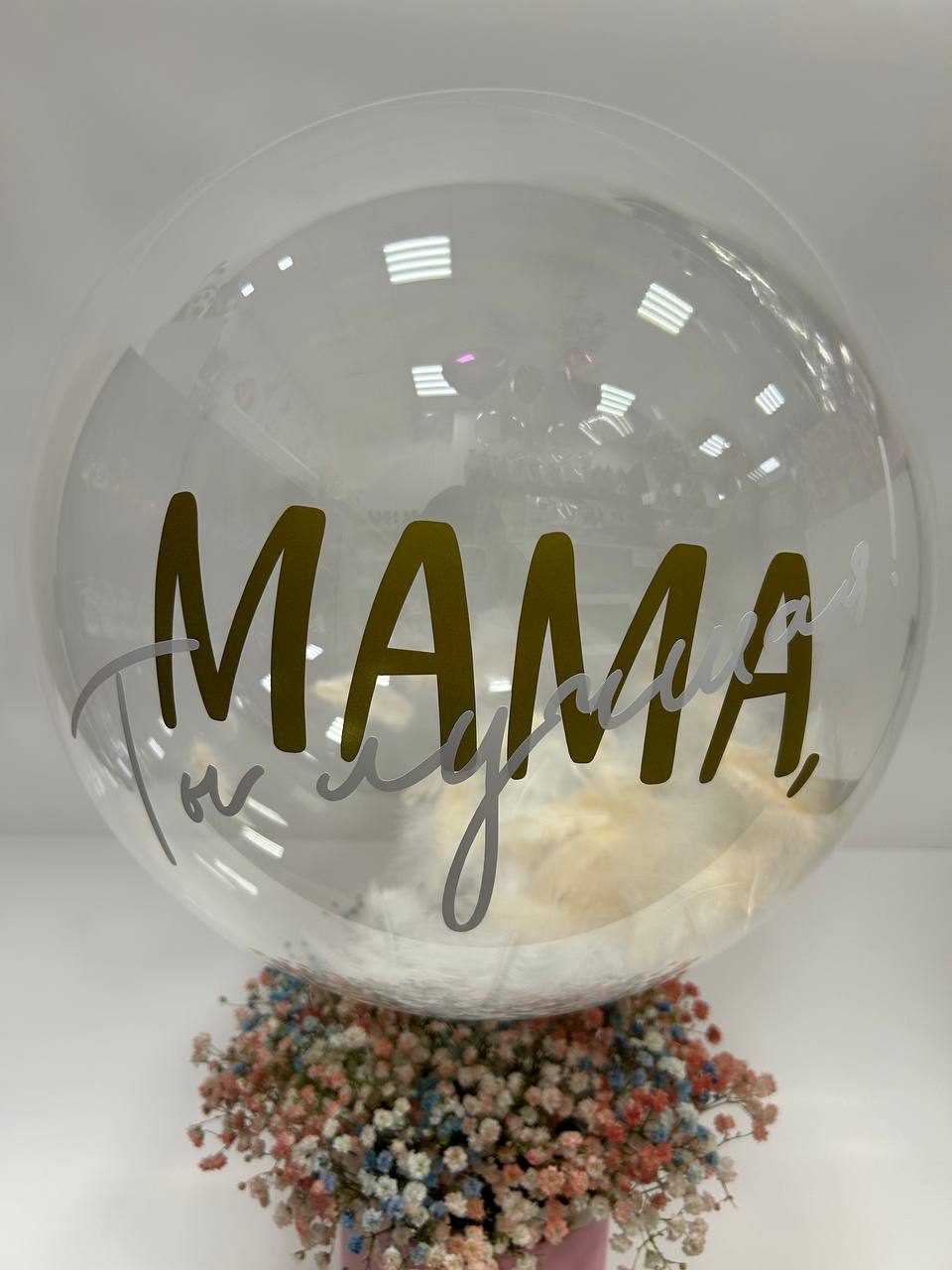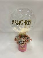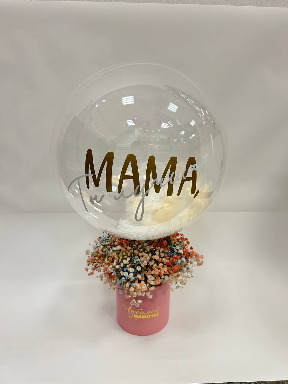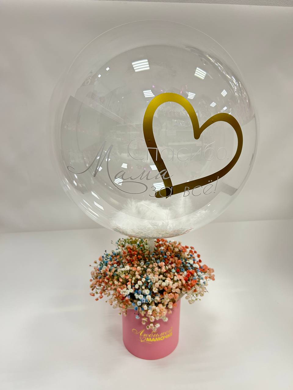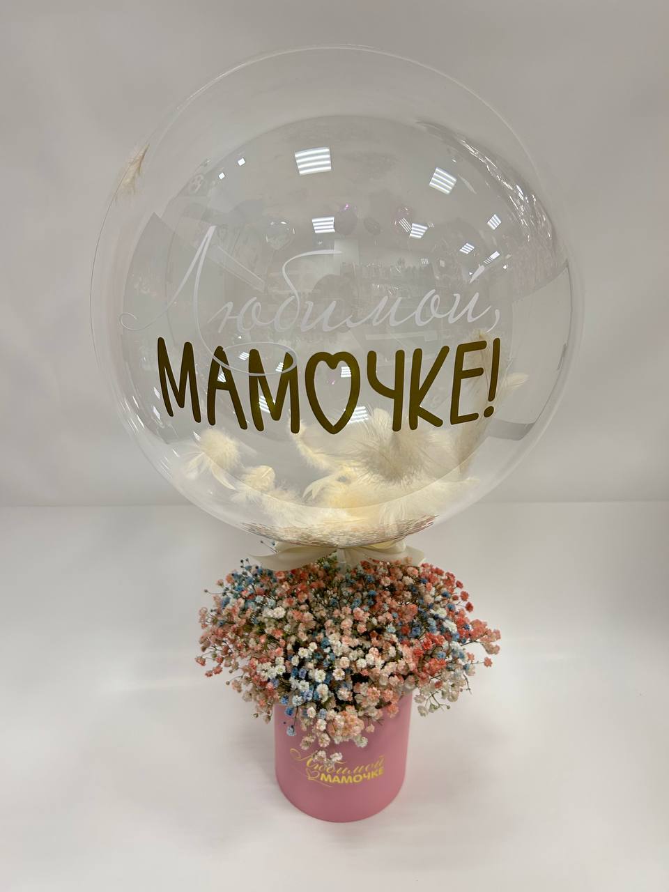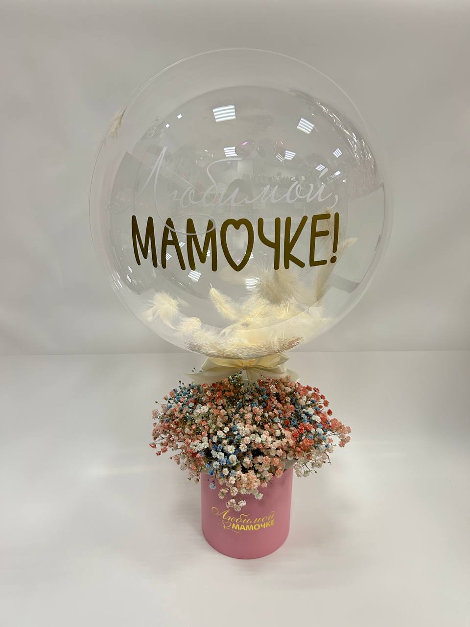 Состав: гипсофила цветная - 7 веток, коробка - 1 шт. оазис - 1 шт, шар баблс с перяьми и надписью, ленты
