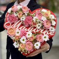 Состав: диантусы - 3 шт, роза одноголовая Топ Гир - 6 шт, роза кустовая пионовидная - 2 ветки, хамелациум - 2 ветки, хризантема сантини - 2 ветки, коробка в форме сердца. оазис