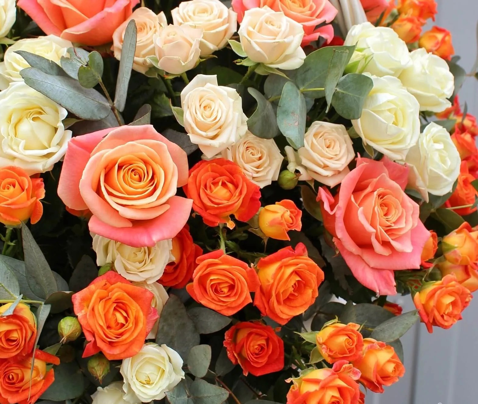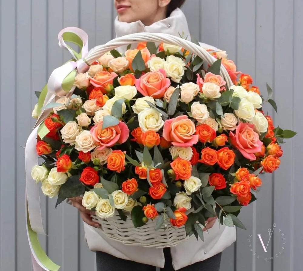 Состав: роза одноголовая эрмоса - 11 шт, роза кустовая - 40 шт, фисташка - 4 шт. корзина - 1 шт., оазис - 3 шт, тишью