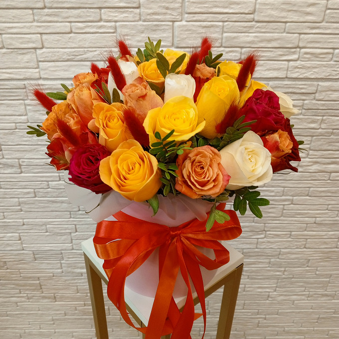 Состав: одноголовая роза яркий микс - 25 шт, лагурус - 30 шт, фисташка - 3 ветки, коробка, оазис, лента