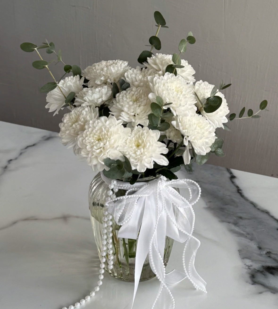 Состав: кустовая хризантема Алтай - 5 веток, эвкалипт - 9 веток, ваза стекло (может отличаться по виду от вазы на фото по согласованию с заказчиком), декор, транспортировочная коробка