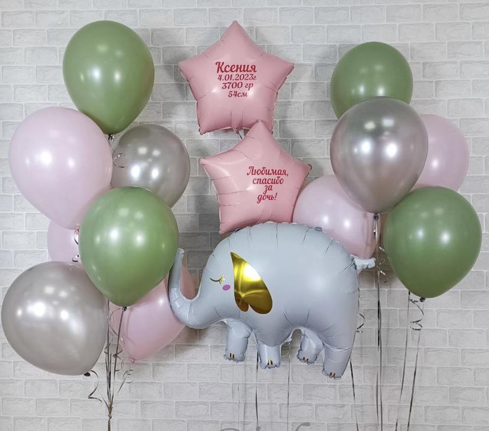 Наши оформители собрали все самое лучшее для встречи новорожденной девочки и ее мамы из роддома: фольгированные шары в форме звезды с индивидуальной надписью (мы сделаем любую на ваше усмотрение), 12 латексных разноцветных шаров, и чудесный слоник, который несомненно украсит собой эту композицию. Композицию удерживают на полу три грузика.