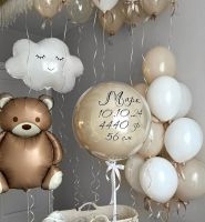В набор входят: фольгированный мишка и облачко, которые привносят уют и нежность в оформление, а также шар дабл стафф «стеклянный» с индивидуальной надписью — идеальный способ запечатлеть важные данные о малыше (имя, дата, вес, рост). Композицию дополняют 10 латексных шаров под потолок, создающих праздничную атмосферу, и фонтан из 10 латексных шаров, придающий объём и завершённость. Шары наполняются гелием и фиксируются, чтобы радовать долгое время.