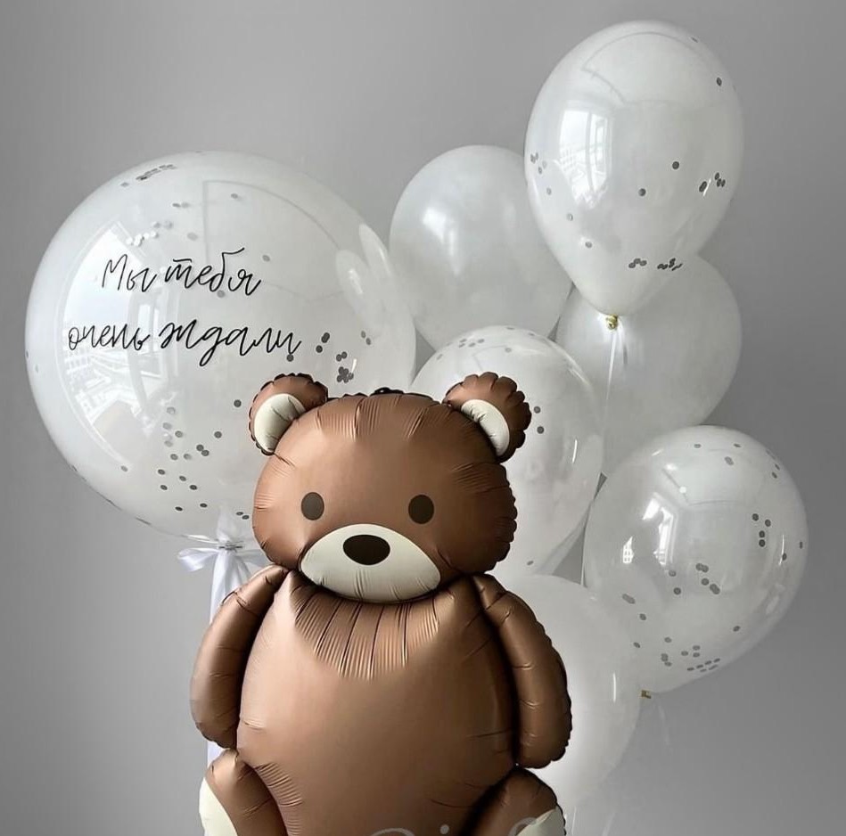 Этот набор включает в себя 1 большой стеклянный шар с конфетти и вашей надписью, 3 стеклянных шара размером 30 см, 3 однотонных белых шара и фольгированный шар в виде очаровательного медвежонка.