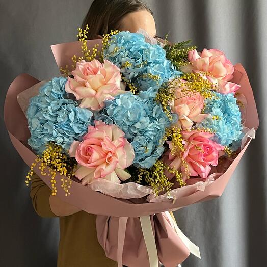 Состав: гортензия - 4 шт, роза пинк мондиаль французская - 5 шт, веточка мимозы - 7 шт, упаковка