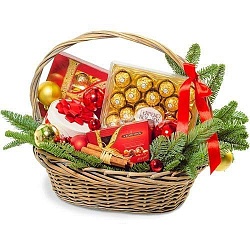 Корзина с нобилисом и конфетами, декорированная елочными шарами, лентой и корицей.