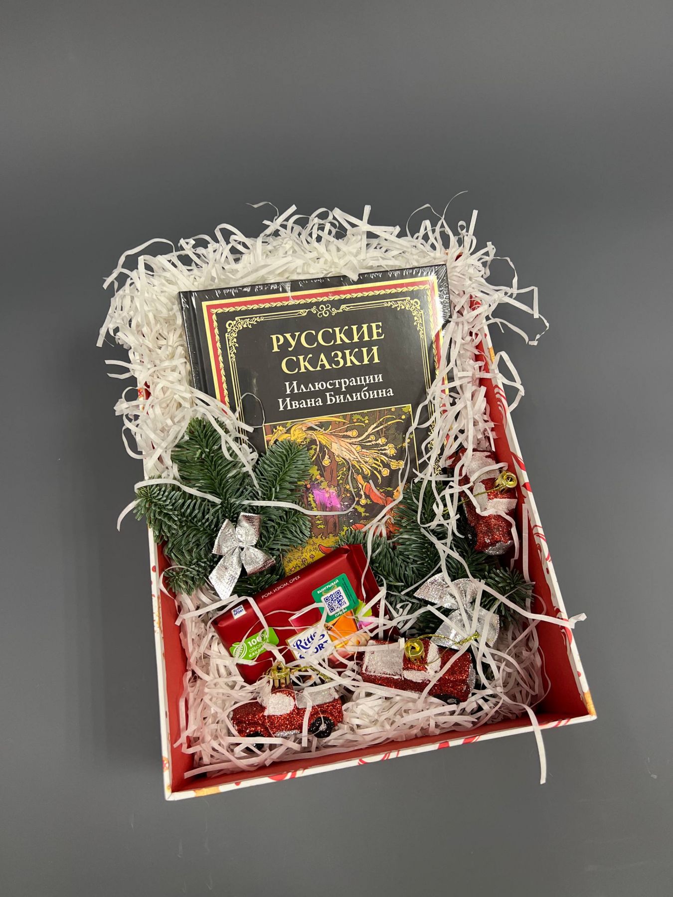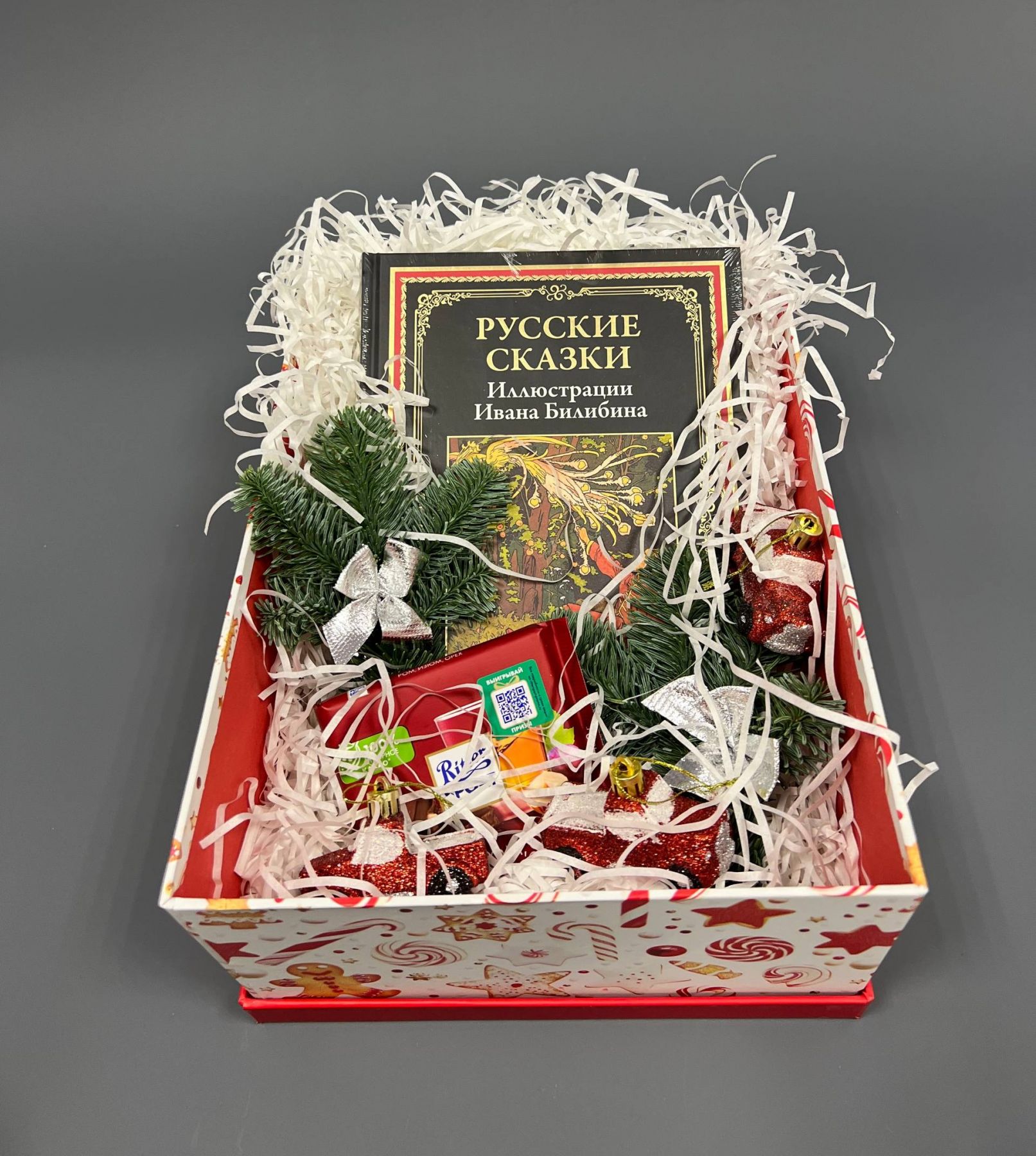 Состав: Подарочная коробка, наполнитель, веточки нобилиса с декором, шоколад "Риттер спорт", конфеты шоколадные ассорти, книга "Русские сказки" - Подарочное иллюстрированное издание отпечатано на отечественной матовой мелованной бумаге Омела с закладкой ляссе одного цвета с капталом. Русские сказки и былины — та неизменная и глубинная основа, на которой воспитывались в детстве и еще долго будут воспитываться целые поколения наших соотечественников. Сборник, который вы держите в руках, включает семнадцать классических русских сказок и шесть былин. Среди них истории про Ивана-царевича, царевну-лягушку, серого-волка, Василису прекрасную, Илью Муромца и еще многих хорошо узнаваемых персонажей. Особенность данного издания в другом. Все иллюстрации в нем выполнены таким признанным виртуозом орнамента и рисунка, великолепным иллюстратором и оформителем книг как Иван Яковлевич Билибин. Именно они придают этой книге уникальный колорит, удивительный мир русских сказок и его героев мы во многом представляем себе именно благодаря уникальным рисункам этого талантливого художника.