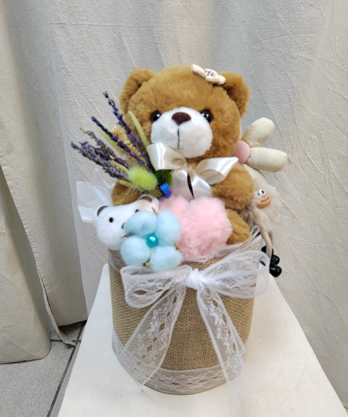 Состав: плюшевый мишка высота 18-20 см, меховой брелок - 2 шт. декоративная подвеска из ткани - 2 шт,