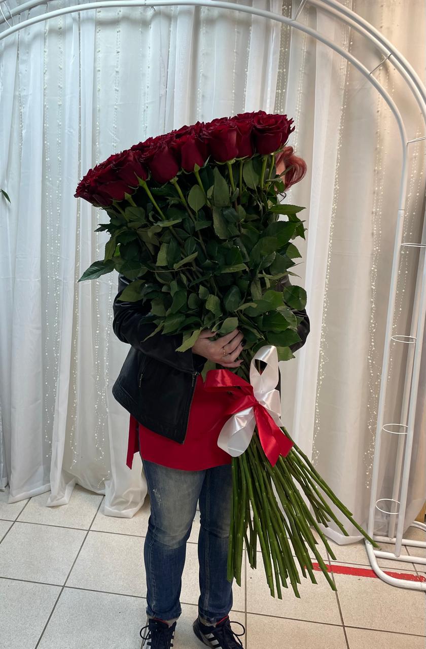 На фото букет из 35 роз длины 120 см под ленту.